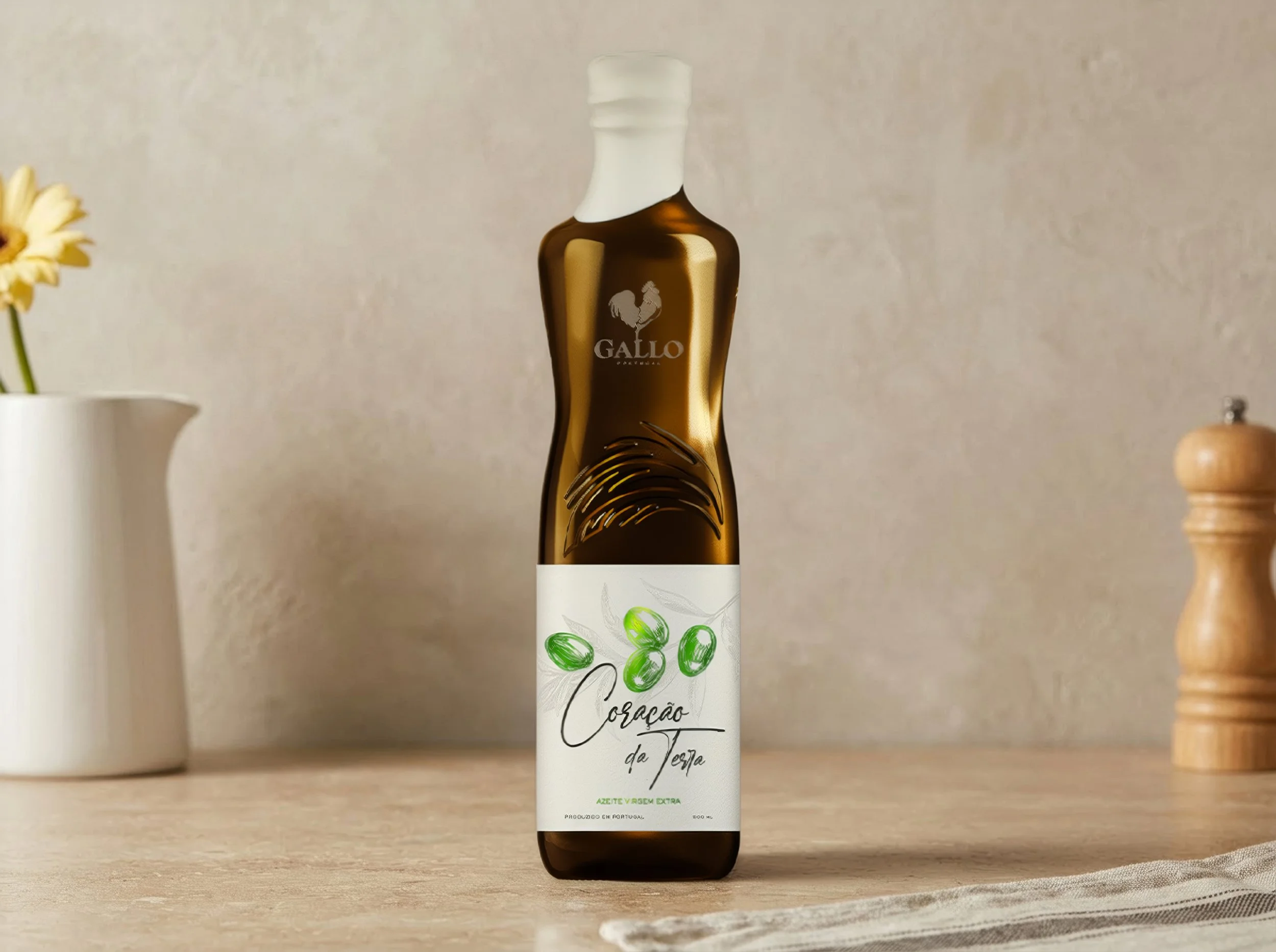 Le projet consistait à concevoir des packs primaires pour la bouteille d’huile d’olive Coração da Terra de Gallo, en respectant les codes de la marque.