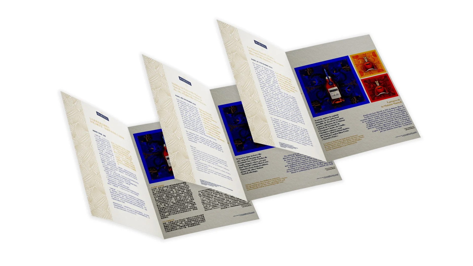 Pensé comme une introduction à l’univers Martell à Paris, ce support éditorial pose le cadre narratif d’une expérience immersive, hommage aux racines françaises de la Maison. Développé en français, en anglais et en chinois, il accompagne le lancement d’un espace éphémère dédié à la personnalisation de deux cognacs emblématiques : Martell Cordon Bleu et Martell XO.